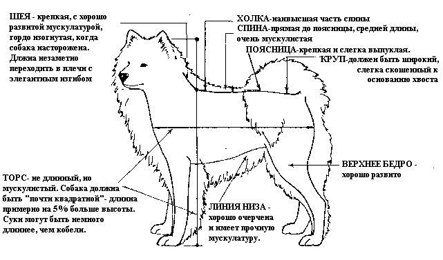 Среднего размера, элегантный белый арктический шпиц. Ощущается мощь, выносливость, шарм, мягкость и уверенность в себе. Знаменитая «самоедская улыбка» создается сочетанием формы и расположения глаз с немного загнутыми вверх углами рта. Пол должен быть ясно выражен.